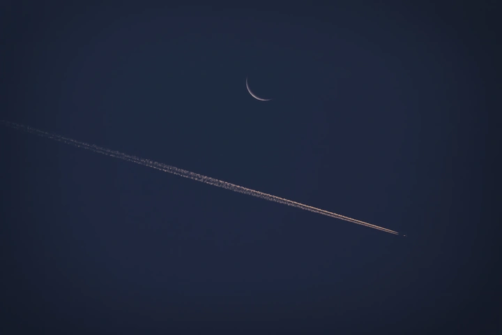 构图以“点—线—面”构建宇宙级留白美学:右下角一弯新月如银色逗号悬于靛蓝天幕,左下延伸的飞机尾迹似未写完的长句,轨迹从模糊渐变为清晰的冰晶颗粒,最终消失在画面外,形成“未完待续”的叙事张力。摄影师采用三分法切割画面,月牙与尾迹的连线恰好构成黄金分割线,而占比90%的深蓝背景则像无边际的宣纸,让这组“天空笔迹”获得呼吸感——极简中藏着克制的韵律,仿佛莫奈的《睡莲》遇见康定斯基的抽象线条。 色彩是雾天黎明的色彩学实验:深蓝夜空从顶部的墨蓝过渡到地平线的靛青,像被稀释的蓝墨水;月牙的银白带着冷调金属光泽,与尾迹的橘红形成冷暖撞色——那抹橘红不是均匀的色块,而是由无数冰晶反射日出微光的渐变,从起点的淡粉到中段的橙金,再到末端的浅黄,恰似打翻的日落调色盘。雾天特有的朦胧感让色彩边界柔和化,冷蓝与暖橙在对抗中达成微妙平衡,像冬夜壁炉里的火焰与窗外的月光,既疏离又相依。 情感藏在“偶然邂逅”的惊喜里:成都难得一见的尾迹与月牙同框,暗合都市人对“不期而遇”的向往。当我们习惯了钢筋森林的灰色调,这道划破天空的橘红尾迹便成了生活的“意外礼物”,即使在最熟悉的城市,抬头也能撞见宇宙级浪漫。