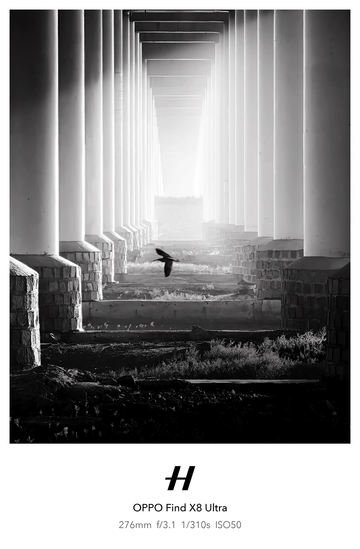 晨雾轻笼,桥梁立柱列成深邃通道,光线在明暗间勾勒建筑轮廓。一只飞鸟划破寂静,地面草石在晨光里若隐若现,于冷硬建筑与灵动生命之间,铺展清晨独有的静谧与生机。