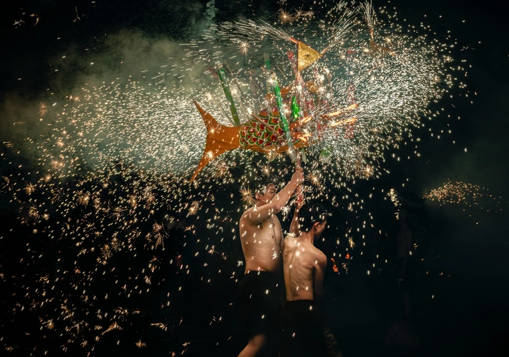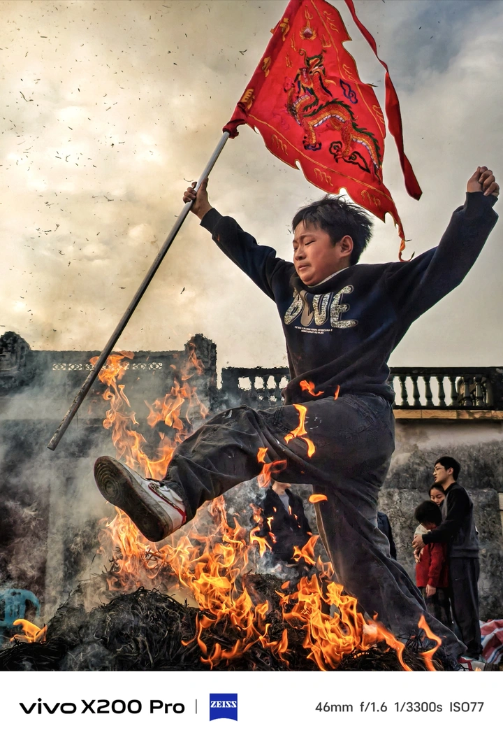 春节期间,潮汕各地“跳火墩”活动热闹非凡。等火堆 燃起火势旺盛时,大人们如猛虎般争先跃过,尽显英 勇。一位少年也倍受感染,他手执鲜艳旗帜,眼神坚 定,鼓起勇气加入其中。这一跃,不仅是对传统文化 的传承,更是勇气与活力的绽放。