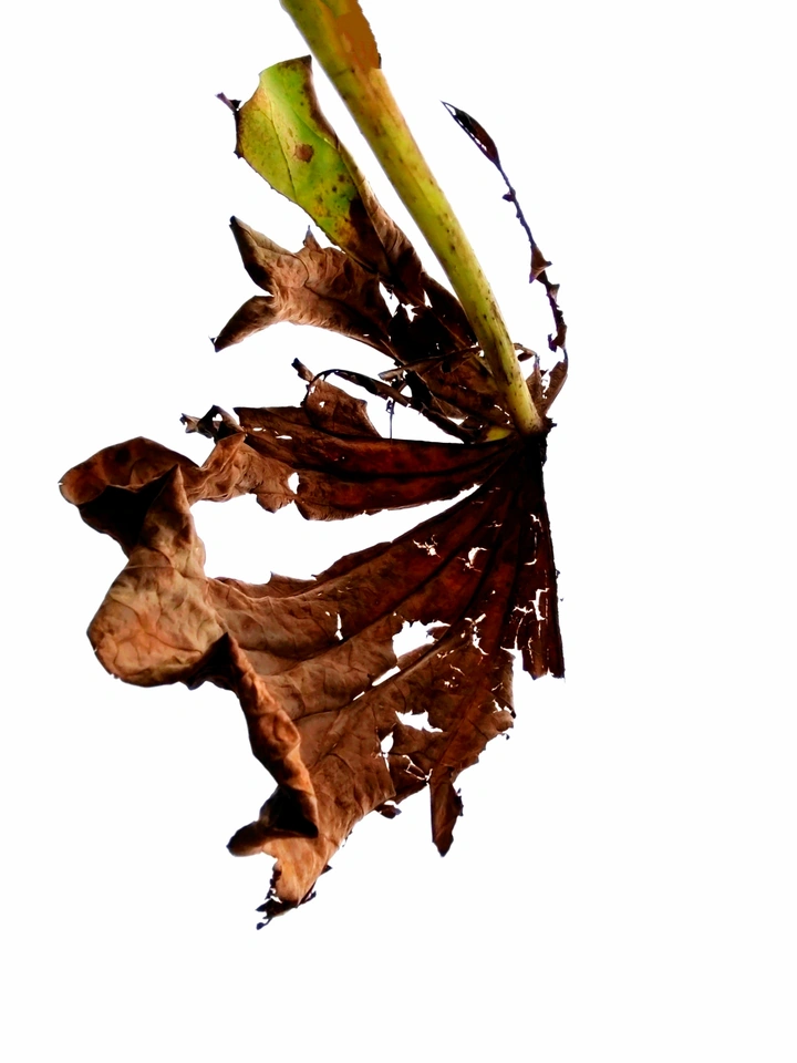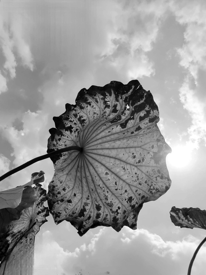图一:这张黑白摄影作品捕捉了残缺的荷叶在阳光下的独特姿态,展现了一种生命流逝的美感。从低角度仰视,荷叶占据了画面中心,与天空中的云朵形成了对比,增强了视觉冲击力。光线透过荷叶,凸显了叶脉的纹理,营造出一种宁静而略带伤感的气氛。构图简洁,主题明确,能够感受到摄影师对自然细微之处的观察和表达。黑白的处理方式也赋予了作品一种古典和怀旧的意味。