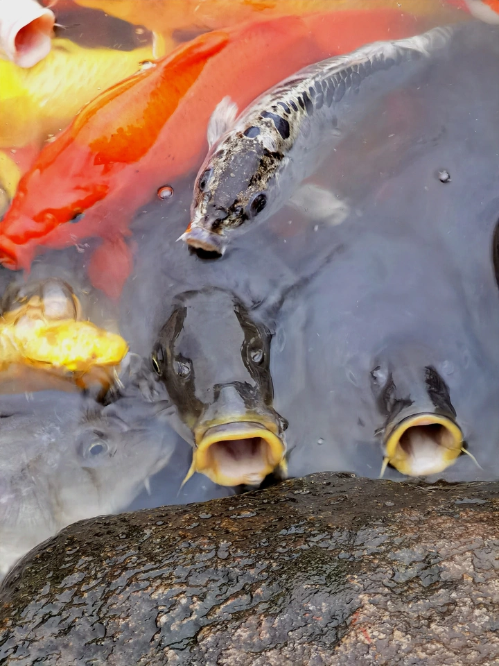 山海关脚下,水池里养的锦鲤,硬是被一波波的游人喂肥了!