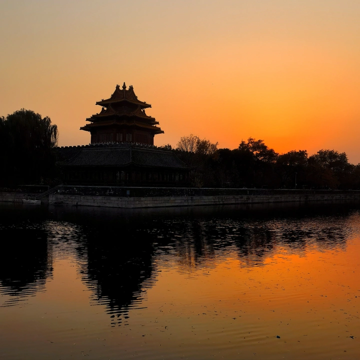 傍晚的霞光把整片天晕染成暖橙,故宫角楼的飞檐翘角浸在暮色里,成了一幅轮廓利落的剪影。湖水揉碎了天边的鎏金,波纹里漾着半城秋光——这是皇城根下独有的温柔,旧时光与晚风起,都落在一汪涟漪里。
