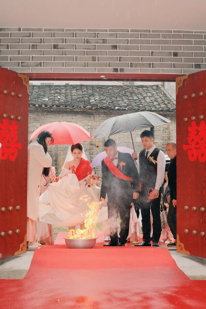 不是每一场婚礼都需盛大喧嚣, 但每一扇门后,都是两个人共同开启的人生。 她撑着红伞,步履轻盈, 他牵着她的手,目光坚定。 身后是祝福,眼前是未来, 而此刻,连雨都悄悄停了。 老屋门前的对联还写着“百年好合”, 像一句早就写好的预言。 他们走过这道门, 也走进了彼此的一生。