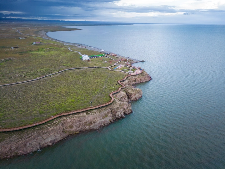 悬崖与湖泊构成的独特景观很有冲击力。站在崖边俯瞰,辽阔湖面与湛蓝湖水如巨幅蓝画铺展脚下,旁边的亲水栈道还能让人近距离欣赏青海湖的美。