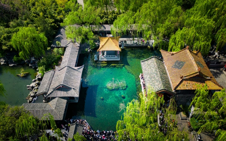 趵突泉水被乾隆皇帝册封为 “天下第一泉”,也是最早见于古代文献的济南名泉。作为济南三大名胜之一,这片以泉为魂的园林,从航拍视角看,古建亭台与澄澈泉池在绿林簇拥中与现代都市接壤,是来济游客的必打卡地。 亲临趵突泉,才懂 “皆若空游无所依” 的意趣 —— 泉水清透如碧,潭中鱼群或红或黑,千百尾在水中悠然悬浮,阳光穿柳影洒在水面,波光与泉涌共舞,静美中透着灵动,让人忍不住驻足,看这份澄澈里的自然生机。 观澜亭畔,“趵突泉” 与 “第一泉” 的石碑静静伫立,见证着泉水千年的喷涌。用喝完茶水的纪念瓶装一瓶泉水留作纪念,将天下第一泉的清冽与诗意,装进了旅客的记忆里。