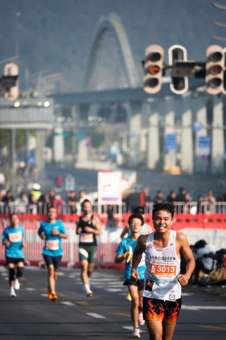 在2025年11月,武汉光谷举办的马拉松比赛上,一名年轻的男子在路过武汉光谷独特的空轨电车地标时,卖力向前奔跑。