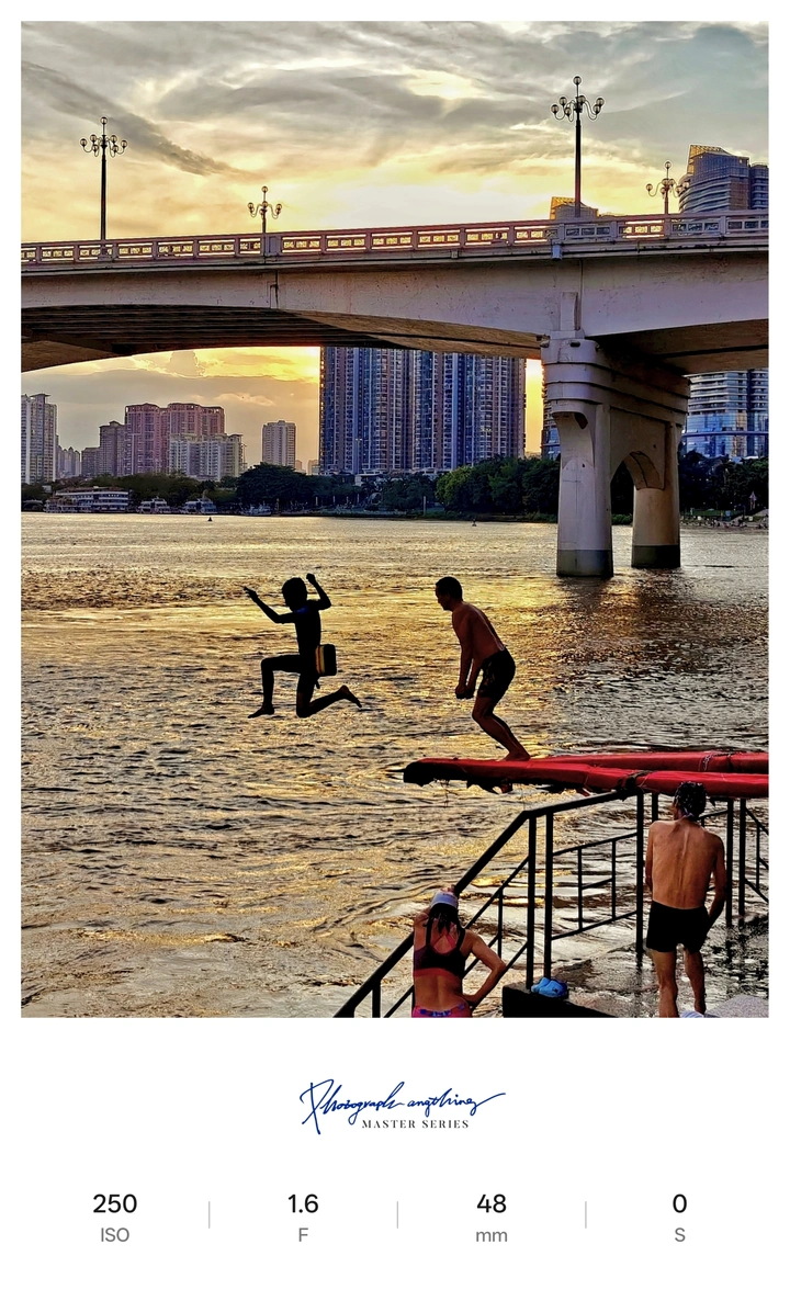 桥影沉暮,波光吻夕阳。孩童似雏燕穿风,跃入粼粼幻梦。那无畏的弧线,是童真划破时光的茧,在自由的水域,漾开童趣的璀璨星图。
