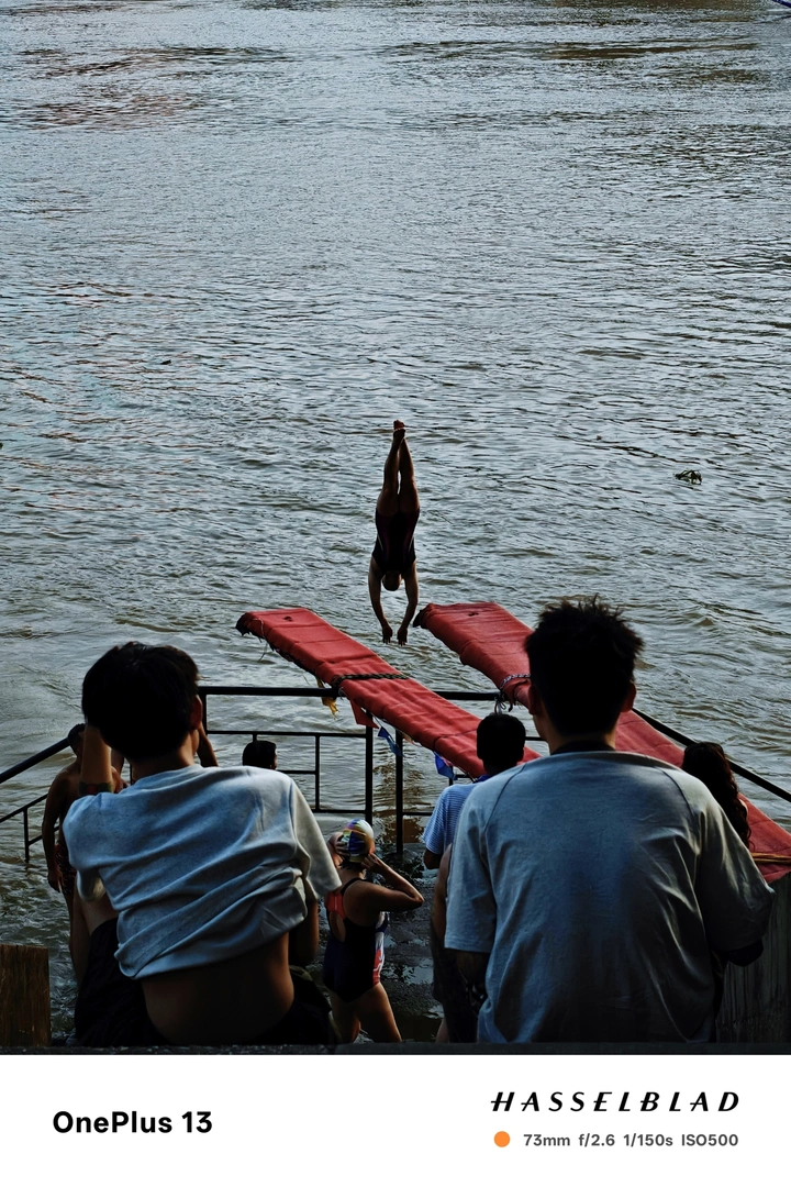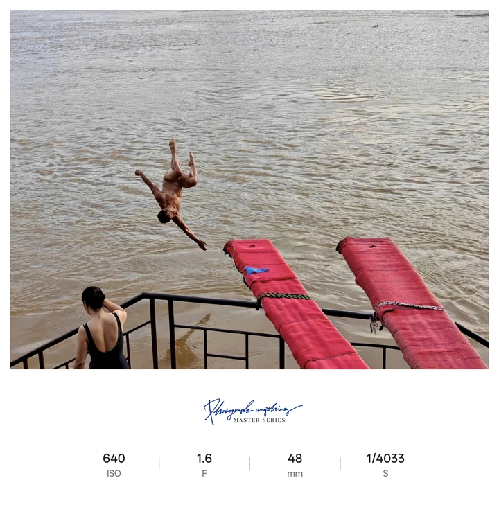 决然一跃,激起千层浪。江边两人的目光,藏着欲言又止。这瞬间,是生活里一场短暂却难忘的幻梦。