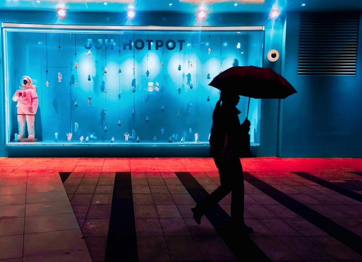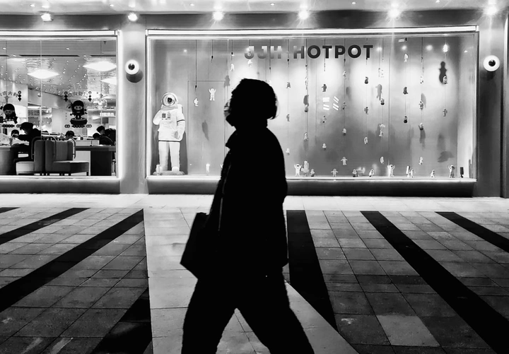在一家火锅店门口,路过的时候注意到了这个门店的色彩对比,还有路过的行人,当时就用手机记录下来了,手机vivoz5 ,拍摄时间江西南昌,时间2022年12月