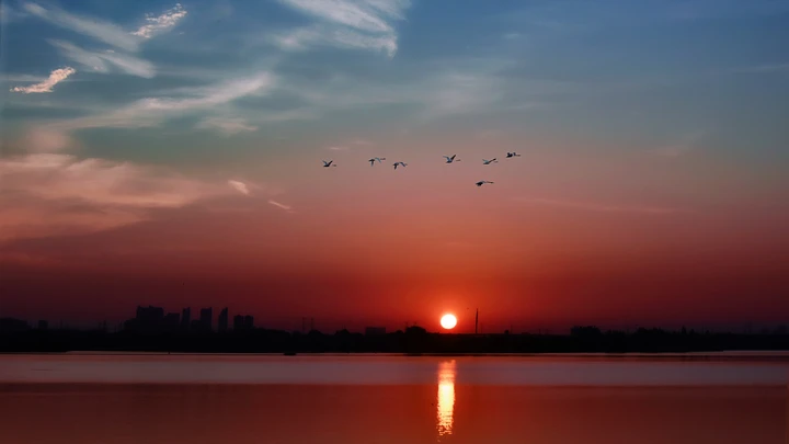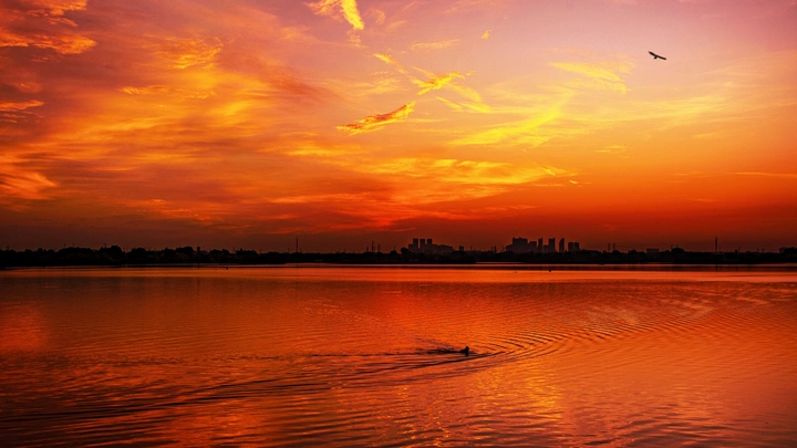 这张照片展示了壮观的日落景象,色彩丰富且层次分明,橙色与蓝色的对比使得整个画面充满活力。光影的运用方面,水面的反射增加了画面的深度感,而远处城市轮廓的朦胧则增强了神秘感和空间感。构图上,主次分明,水中的动物引导视线,吸引观众的注意力。 在情感表现方面,日落象征着一天的结束,常常引发观者对时间流逝的思考,容易唤起人们的回忆与情感共鸣。照片不仅展现了自然之美,更引发了观者对于生活和时间的反思。 然而,在后期处理方面,可以进一步提高照片的层次感与对比度,增加前景的细节,使得整体更为生动。此外,可以考虑调整曝光,使得天空的色彩更加饱满,同时水面的波纹可以通过微调提高表现力,增强画面的动感。综上所述,这张照片在技术上非常出色,具备引发观众深思的潜力,稍加改进将更加完美。 武汉进入八月份,每天都有艳丽的彩霞或者晚霞出现,这张是8月5日早上5:43摄于武汉东湖磨山绿道,云层组合成2只神似凤凰飞天,非常难得遇到这种云层