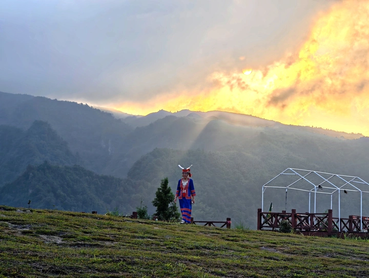 此画面聚焦于自然与人文交融之景。画面以山峦为底,厚重的云雾与金黄霞光交织,营造出神秘而壮阔的氛围,光线穿透云层洒下,赋予场景层次感与神圣感 。身着民族服饰的人物立于草坡,独特头饰、鲜艳衣装,成为人文符号,与自然背景形成对话。人物、霞光、山水共构,既展现自然之美,又传递民族文化独特魅力,记录下地域文化与自然景观碰撞的瞬间,诠释人文与自然和谐共生的意境,唤起对多元文化及自然之美的关注与珍视 。