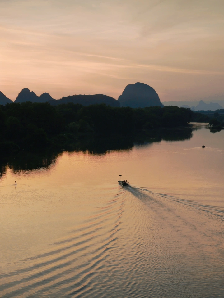 漓江的烟雨最是善变,晨起时如轻烟袅袅,将群山装扮得含蓄婉约;午后又化作薄纱,让阳光穿透云层,在山巅洒下斑驳光影;傍晚则与暮色交融,将整条江流染成黛青色。