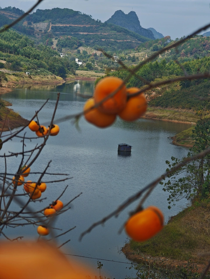 从红岩村出来,到新华水库偶遇到这一片柿子林,太出片了。山水做背景,清澈的水面倒映着蓝天,柿子林有自然的坡度,层层叠叠,比那些热门景点更原始生态,随手一拍都像油画里的场景。如果水库里有竹筏轻轻划开碧水,船夫篙子一落,风里都裹着软甜的香甜。