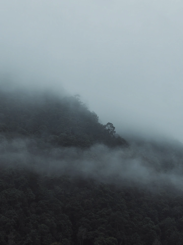 山被浓得化不开的雾裹成了半透明的墨色,连风都慢下来——建筑蜷在山坳里,像被云藏起的心事;枯枝在雾里支棱着,是没说出口的怅惘;连每片叶尖的湿意,都浸着“天地都静了”的孤清。像一场没醒透的梦,裹着凉津津的温柔,又藏着望不穿的沉郁。
