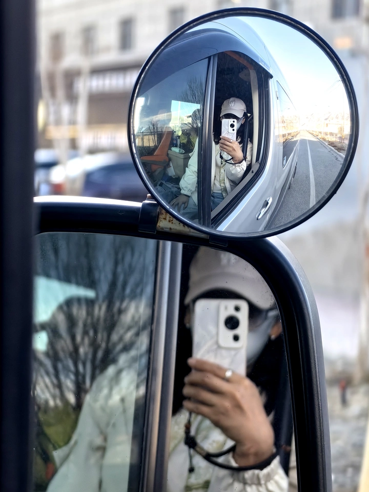 透过公交车的凸面镜,把车内的自己和车外的街景都框了进来,一层镜里是举着手机的自拍,另一层镜里是整个车厢的细碎日常,像把生活叠进了双重镜头里~
