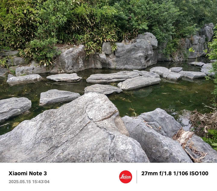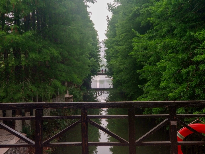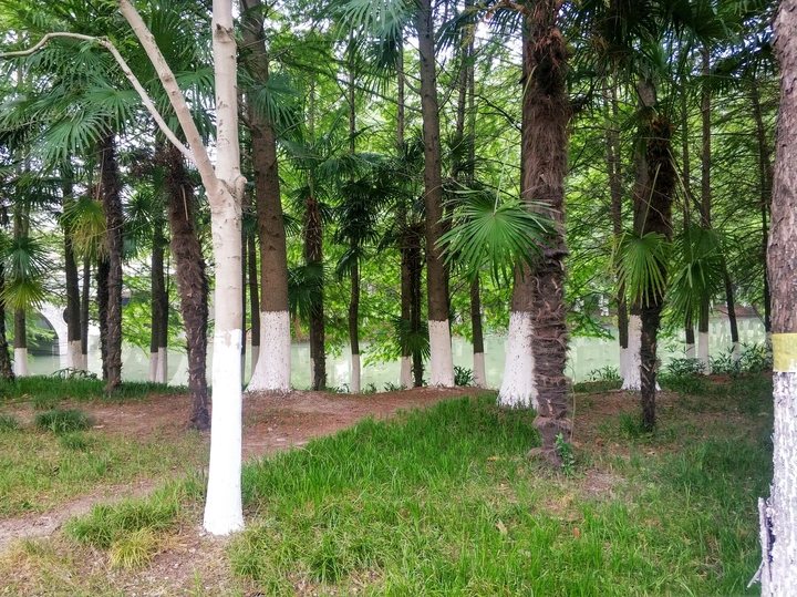 公园林木溪水旁,一片葱绿入眼帘。 盐城市盐渎公园随拍。