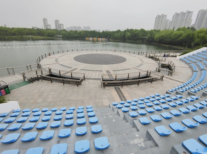 盐城市盐渎公园的湖边有一个露天广场,一排排座位围成了一个半圆。