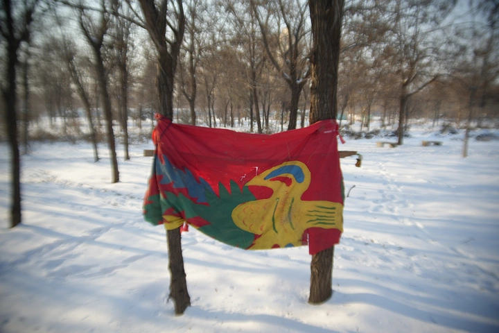 雪后的树林里,不知道是做什么用的一块红布,神秘奇怪的图案,好像神迹!
