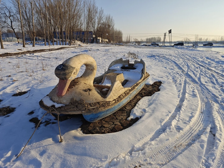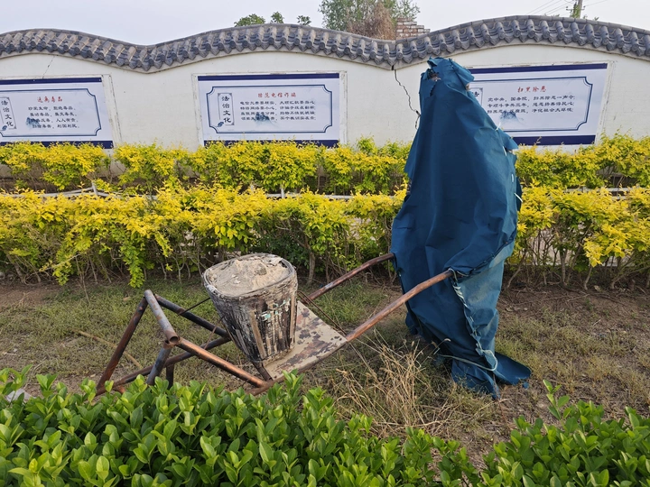 村边绿化带的雕塑,可能是为了保护套上了保护衣,而今衣服破了,显得荒诞又滑稽