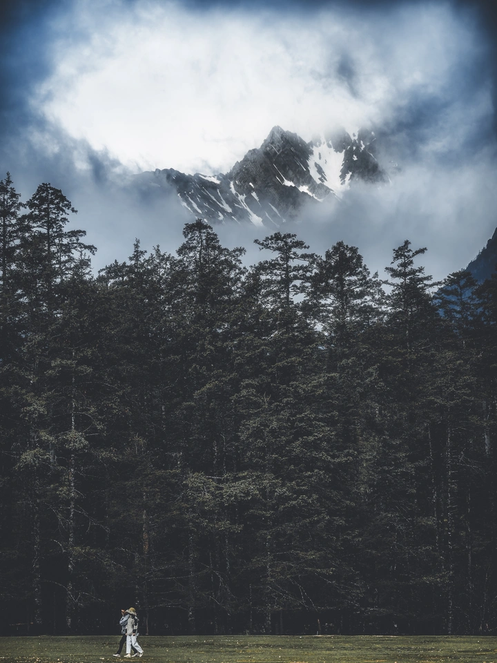 草坪两人慢走,森林如墨色屏障,雪山浮在云际像未醒的梦,与人间隔了层雾的距离,静得像诗。