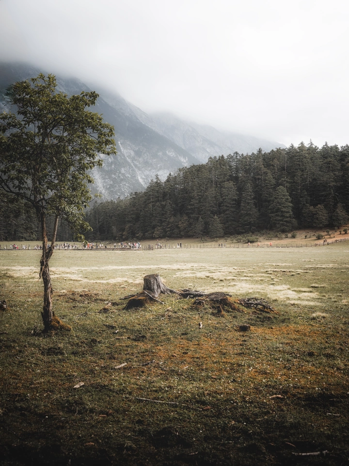 牦牛坪青草如茵,玉龙雪山在云雾中若隐若现,雪光穿透云层,与下方葱郁树林相映,静谧而神圣。