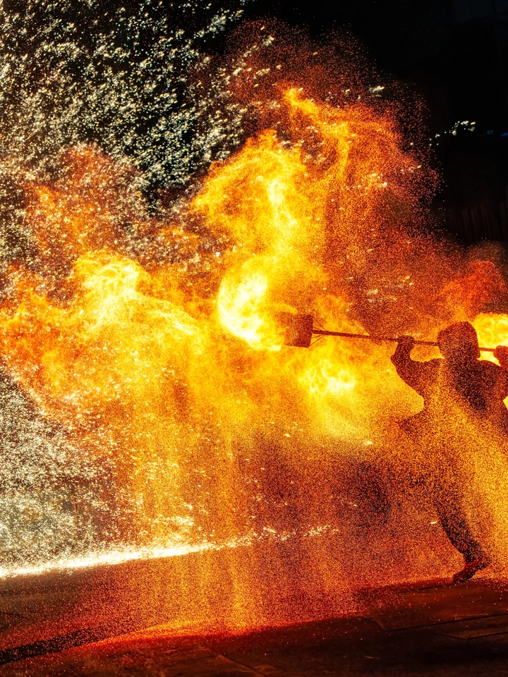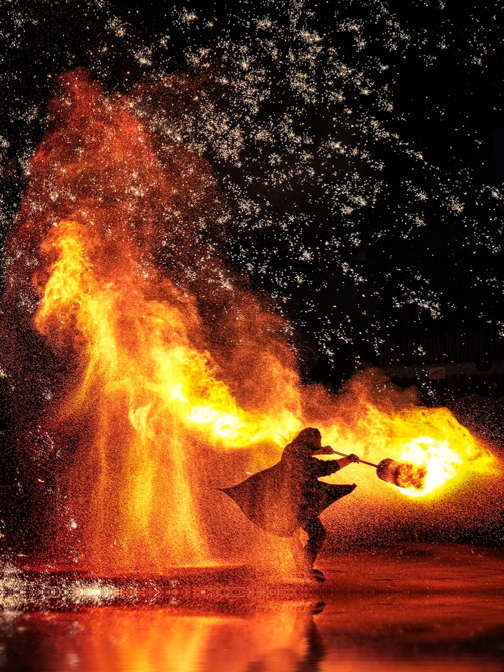 深夜黑幕里,火壶表演者挥臂击焰,橘红火焰在撞击中炸开,与身后飞溅的铁花交织,将传统技艺的热辣注满夜色。