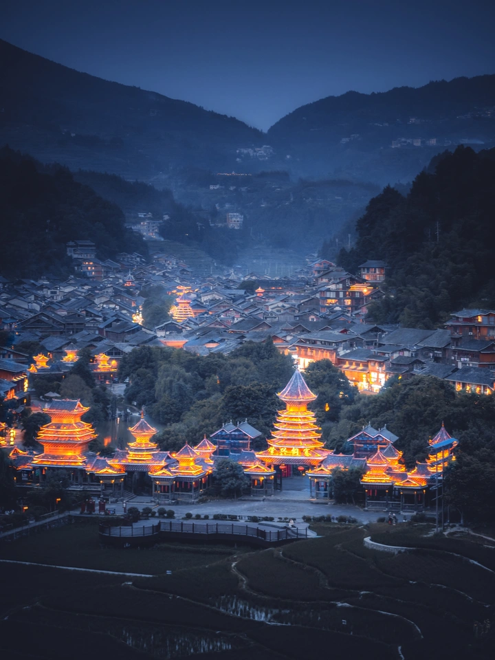 傍晚的侗寨,鼓楼与民居的灯光渐亮,像串起的诗行,嵌在山坳里,暖了暮色