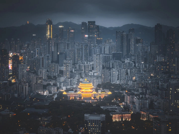 城林如海,金殿为珠,传统建筑与现代楼宇相映,重庆夜的璀璨交响。