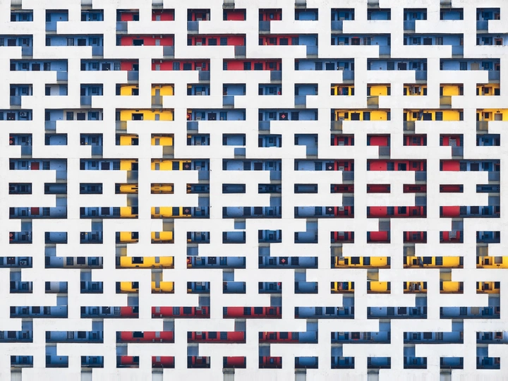 蓝红黄三色方块组合成迷宫式墙面,现代建筑的创意与地域特色融合。