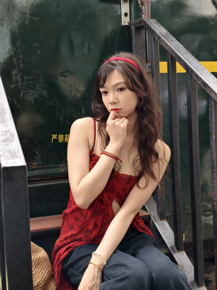 绿皮车厢载着旧时光,红裙在风里漾开港味的浪漫,好像一抬手,就能触到当年的霓虹与温柔。