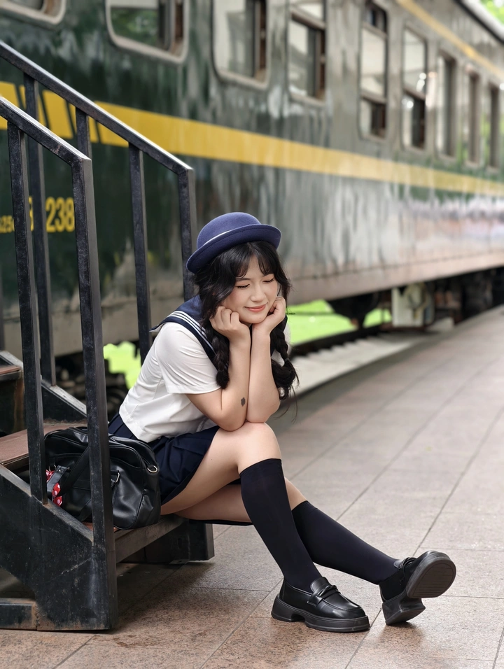 微风托起少女的裙摆与遐想,列车载着云朵掠过蔚蓝。她指尖轻触帽沿,将心事寄给驶向远方的风