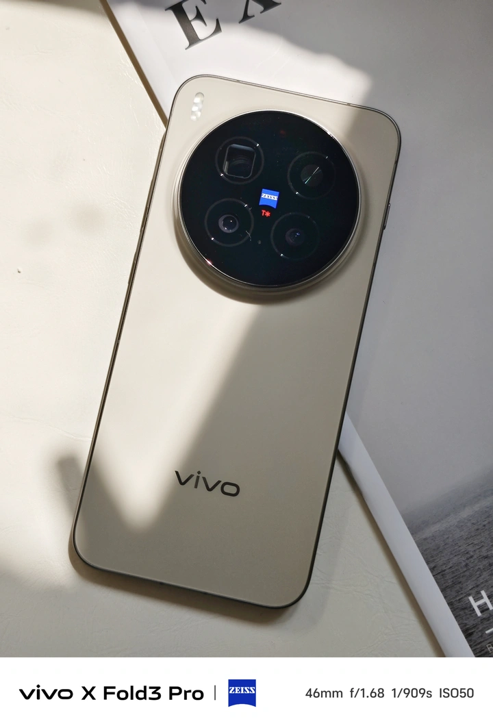 vivo X300 Pro到手第一感觉是颜色挺特别——不是那种扎眼的亮棕,偏暖调的淡棕,光线好的时候能看到细微的光泽,像磨砂皮那种质感,比普通棕色更有层次。 后盖是丝绒玻璃,摸起来真的不沾指纹!之前用的手机后盖总要擦,这个裸奔两天也没啥印子,懒人友好(笑)。 后摄模组是悬浮设计,和水滴玻璃衔接得挺自然,不像有些手机凸一块儿或者有明显断层,视觉上更干净。 边框是钛合金的,比想象中轻,边角磨得圆圆的,握久了不会硌手。侧面比同事的X200 Ultra薄一丢丢,重量192g,上一代是200g,少了8g实际拿手里能感觉到差别,不算特别轻但也不坠手。 配置是5000万主摄+5000万超广角+2亿APO长焦,主摄和超广角就是超常规水平,远景拍月亮、拍花都能放大看清纹理,夜景也很稳。附几张vivo X Fold3 Pro的外观特写。