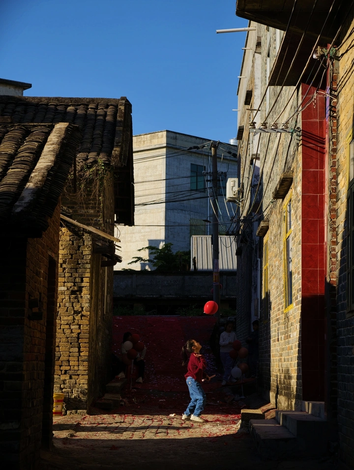 宴席喧嚣渐散,欢乐却未停歇。静谧的阳光洒进小巷,伴随小朋友追逐那只跳脱的气球。