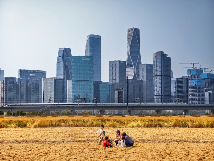 在现代都市的繁华背景下,高耸入云的摩天大楼展现着城市的蓬勃发展与活力。一列高速行驶的高铁,如同城市跳动的脉搏,象征着时代的飞速前进。而前景中,金黄的稻田上,一家人围坐在一起,孩子们嬉戏玩耍,洋溢着纯真的快乐。这里是城市与自然的奇妙交汇,繁华与宁静在此刻和谐共生,记录下这片刻的美好,让人感受到生活的多样与美好。