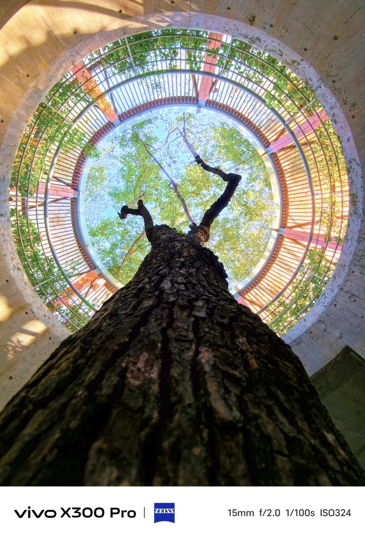 画面中,一棵挺拔的大树从底部向上延伸,树冠枝叶繁茂。环绕大树的是圆形的建筑结构,建筑与自然在此巧妙融合。阳光透过枝叶洒下,光影交错,展现出一种独特的和谐之美,仿佛诉说着人类与自然共生共荣的美好愿景。