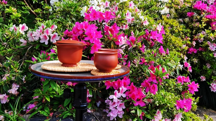 茶之清香,花之美丽,相互辉映,岁月静好。拍摄于2024上海(国际)花展主会场之一的上海植物园。在杜鹃花盛开的斜坡上,见一年轻摄影人把自制的托盘放在花丛中,俨然成了一茶几,然后他摆上了茶具……好有意境啊!在征得他的同意下,拍摄了这个小视频,留下一份美好! 花与茶的邂逅,如同月光洒在湖面,泛起涟漪,一种恬静,一种清馨,让人心旷神怡。#我的摄影日记#2024上海国际花展。 拍摄时间:2024/4/20 拍摄器材:HUAWEIP40Pro