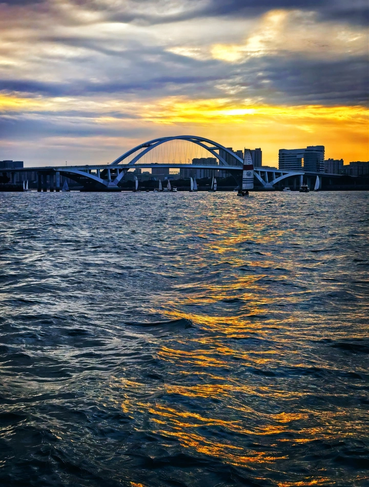 日落时分,余晖为海面披上一层金纱,波光粼粼。远处的桥梁横跨海面,在晚霞的映照下,轮廓被勾勒得格外温柔。一艘帆船悠悠飘荡在波光潋滟间,船帆被海风轻轻鼓起,仿佛正追逐着落日的脚步,驶向被霞光染透的远方,静谧又美好。