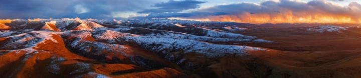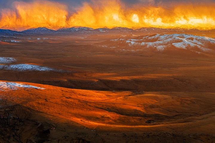 雨云+落日+雪山+冰原,仿佛一团天火在天际熊熊燃烧。