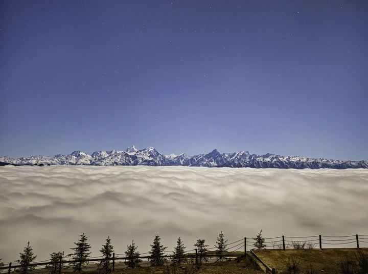 贡嘎群峰在月光的照耀下,与云海星辰相得益彰,更显雄伟与神圣!