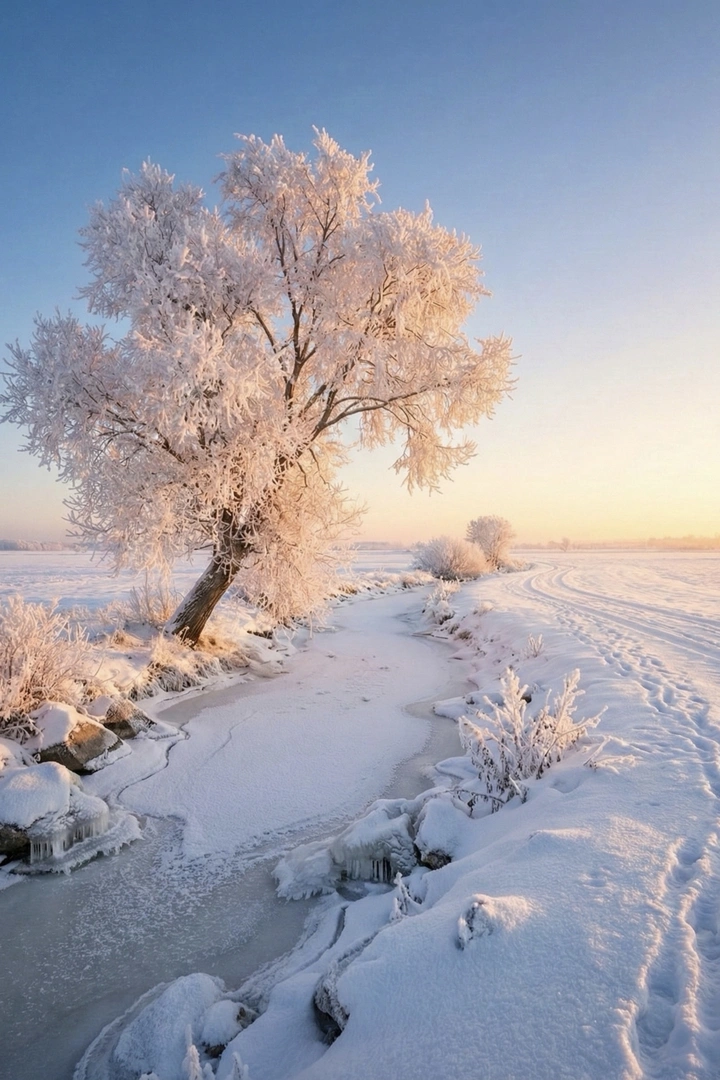 晨光落在覆着薄霜的树梢上,整片雪地被悄悄染上一层柔软的金黄色。冰封的小溪静静蜿蜒,像冬日里沉睡的脉络。脚下的雪发出细碎的声响,周围的世界仿佛被调成了静音模式。这样的寒冬,不再显得冰冷或荒寂,只剩下宁静与纯粹……