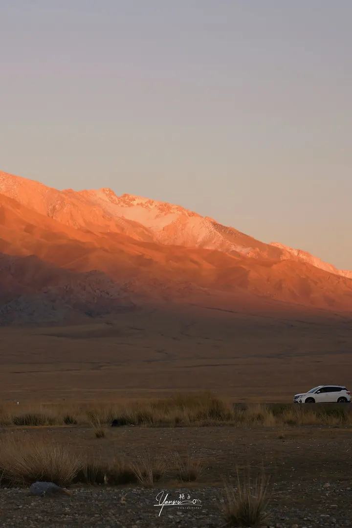 去赛里木路路上,不期而遇…·原来真的会有一个地方,还没抵达就没到失语… 📍 天山轮廓在晨雾中浮现 仿佛神祇遗落在人间的宣纸水墨 摇下车窗的瞬间 风里混着雪松与湖泊的呼吸 🌅 破晓时湖面是揉碎的蓝宝石 日落时湖水变成流淌的熔金 同一片湖 在十二小时内 为我下了两场金色的雪 📸 后视镜里是绵延的雪山 导航仪显示「前方连续弯路 请慢行」
