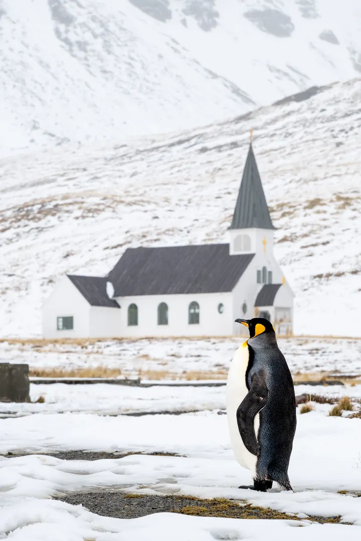 南乔治亚岛的(Whalers Church),坐落在格里特维肯(Grytviken)旧捕鲸站的尽头,背靠雪山,面朝海湾。它纯白的外墙在灰蓝色的极地天光下格外宁静,仿佛在守护这片荒原上的一丝人类痕迹。 而在教堂前的草地与沙滩上,常常能看到成群的王企鹅。它们昂首挺立,金黄的颈羽在风中闪光,仿佛一群静默的朝圣者。 有的聚在教堂门前晒太阳,有的悠然踱步,偶尔传来低沉的鸣叫声——与风声、海浪声交织在一起,像是一场无声的祈祷。 那一刻,人类与自然仿佛融为一体: 古老的教堂在岁月中沉默守望, 王企鹅在雪原与风海之间延续生命。 这里不只是世界的尽头, 更像是时间的尽头—— 唯有宁静与永恒相伴。