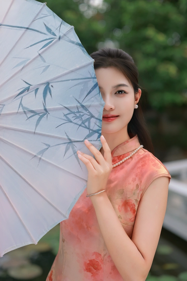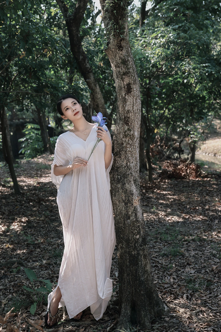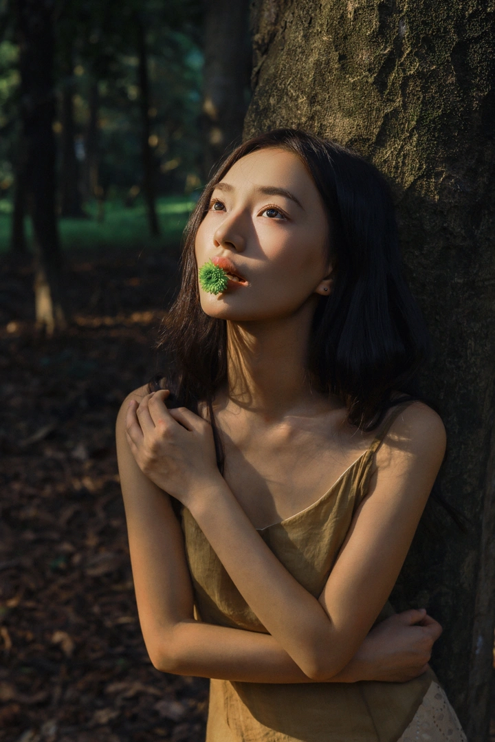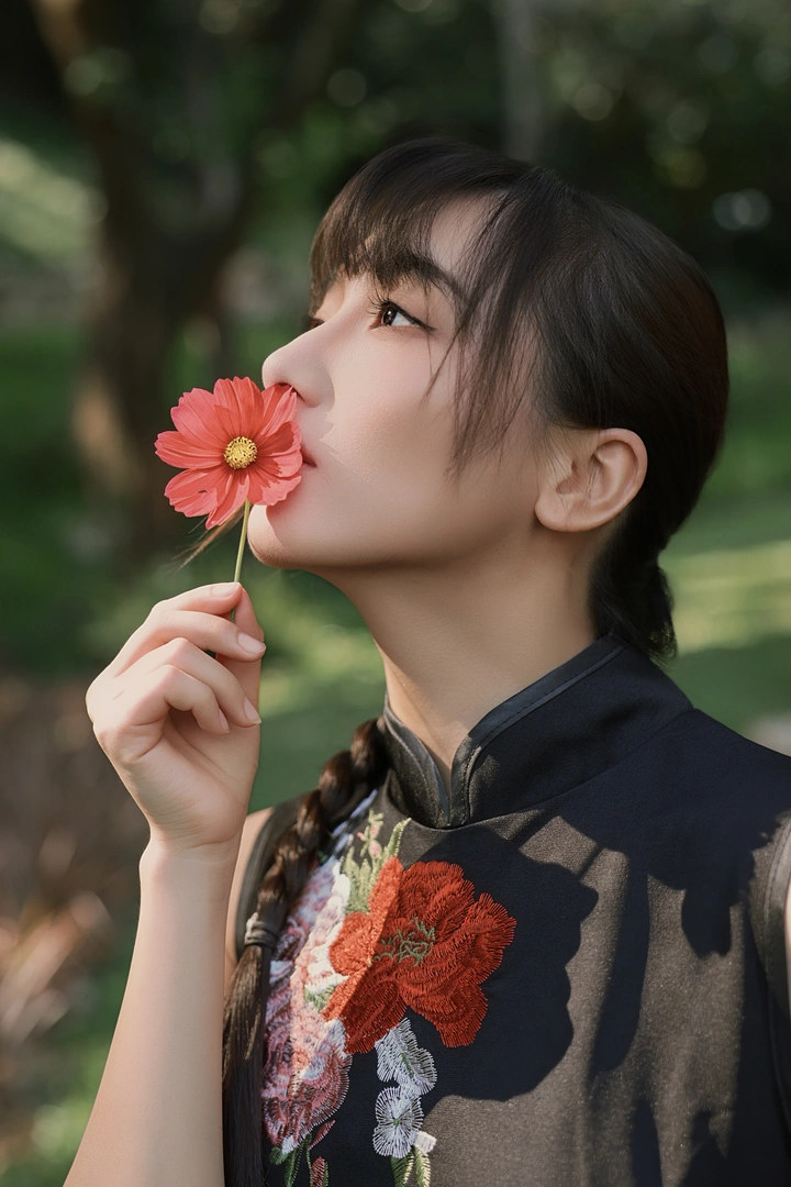 墨色旗袍裁着绣纹的细光,指尖捻着的花恰好抵在肩头——林子里的风裹着叶香漫过来,连落在裙角的光斑,都浸着软和的秋意。