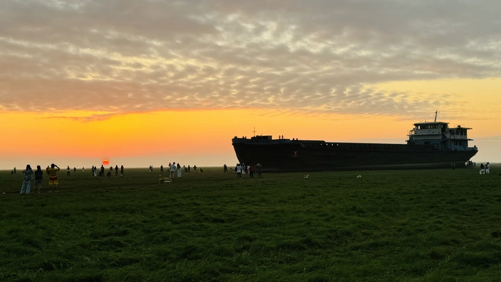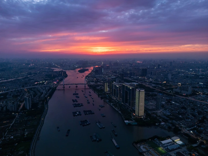 城市日落时分,壮丽景致铺展。河流如天然引导线,牵引视线延伸,拓宽空间纵深感。暖色调轻柔晕染,营造出温馨宁静氛围,将城市与自然和谐共生之美,诠释得恰到好处 。