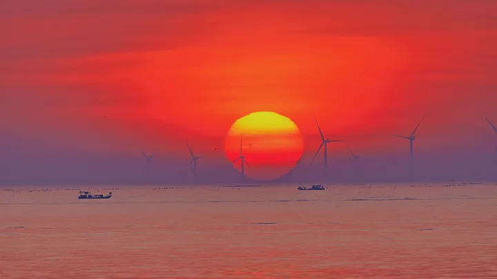 当太阳缓缓升起,将天空染成一片绚丽的橙红色,风车在晨光中轻轻转动,渔船在海面上缓缓前行,仿佛在诉说着新的一天的开始。海风轻拂,海浪轻拍,一切都在宁静中充满希望与力量。