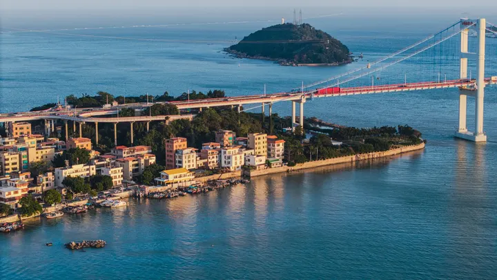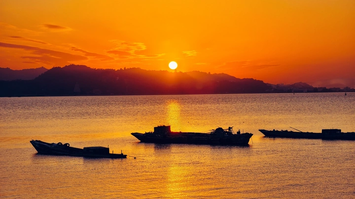 礐石大桥的钢索织就一张网,恰好兜住汕头黄昏里这颗烧得正红的落日。海面风轻,船影渐缓,连钢筋水泥都浸在了橘子味的温柔里。