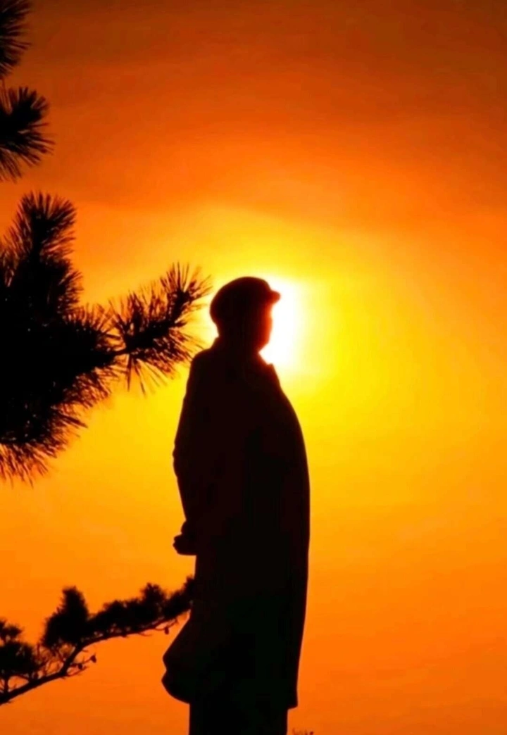 夕阳的余晖洒在毛主席的背影上,那身影显得格外坚毅。一旁的松枝微微摇曳,仿佛在默默守护着这令人崇敬的身影。那轮红日,恰似毛主席心中对国家和人民的热爱,光芒万丈,一直照耀着我们。每次看到这背影,心中都涌起对毛主席的深深敬意和怀念。