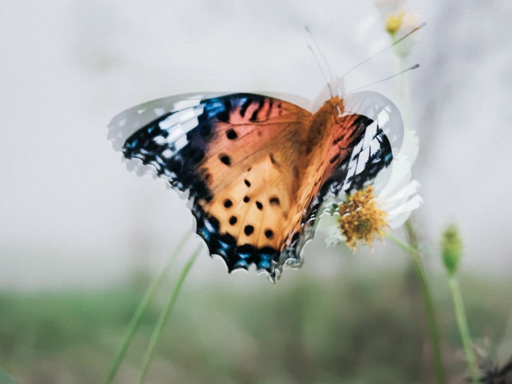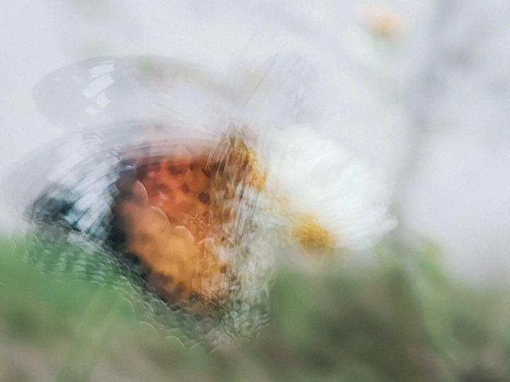 朦胧似梦之中,蝴蝶与花相伴,绿意萦绕,似在静谧时光中轻舞。