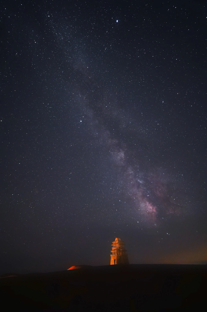 民勤沙漠的夜凉得像冰,我裹着冲锋衣蹲在沙堆里,等银河从墨色里洇出来。前几天听守园人说,那座木塔在这儿立了快二十年,没游客时,星星是它唯一的观众。凌晨三点,银河突然像被谁抖开的蓝紫绸子,“唰”地垂到木塔尖上,暖光从塔缝里漏出来,把沙粒照得像碎金。我按快门时手都在抖,感觉不是拍照片,是撞见了沙漠把“宇宙的信”拆给木塔看——星星密密麻麻写满页,木塔站在那儿,把民勤的沙、人的执着,全酿成了星河下的孤勇。