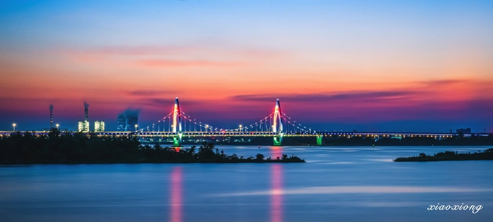 被这幅绝美江景狠狠拿捏!晚霞给桥镀上梦幻光晕,水面像揉碎的蓝紫色绸缎,连呼吸都染上浪漫~🌉✨